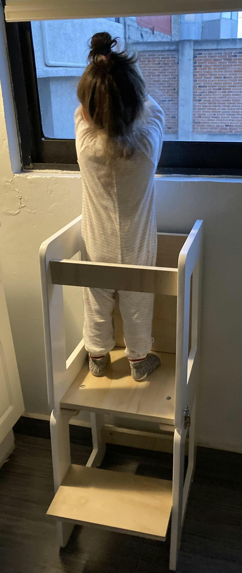 Esta torre permite que los niños realicen actividades como lavarse los dientes, cocinar algo contigo, lavar platos, lavarse las manos, por mencionar algunos, de manera independiente bajo supervisión.